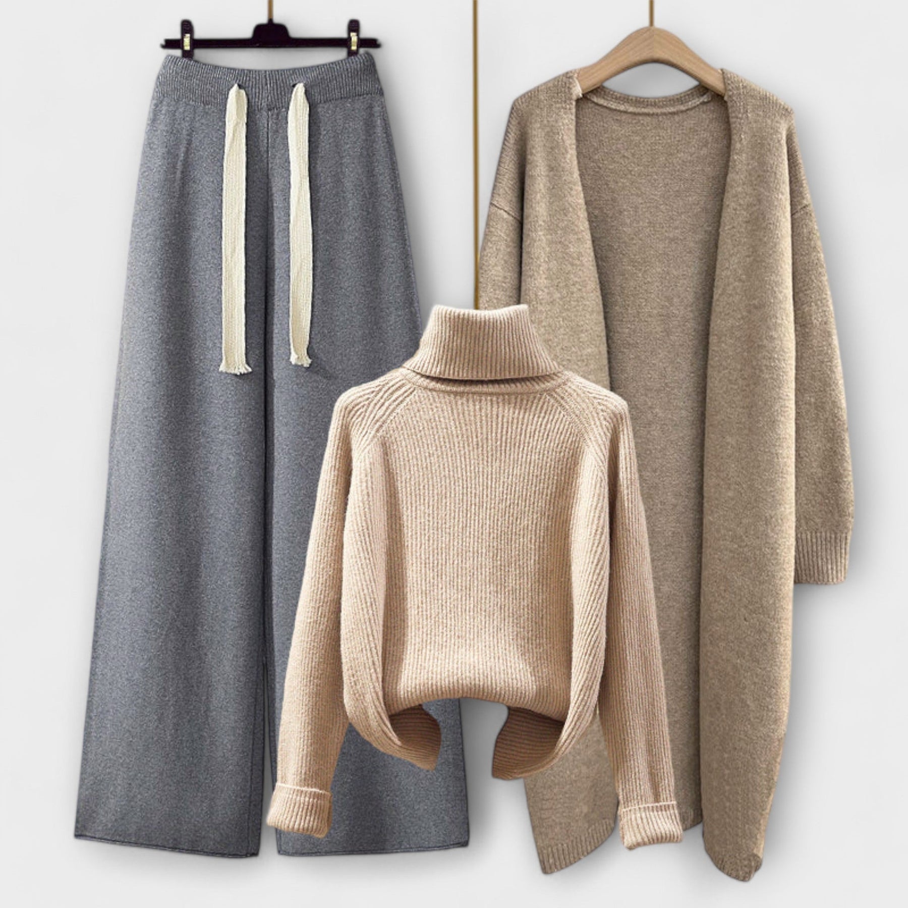 - Complete 3-piece set – Includes a high-neck sweater, a long cardigan, and high-waisted wide-leg trousers for a harmonious look.